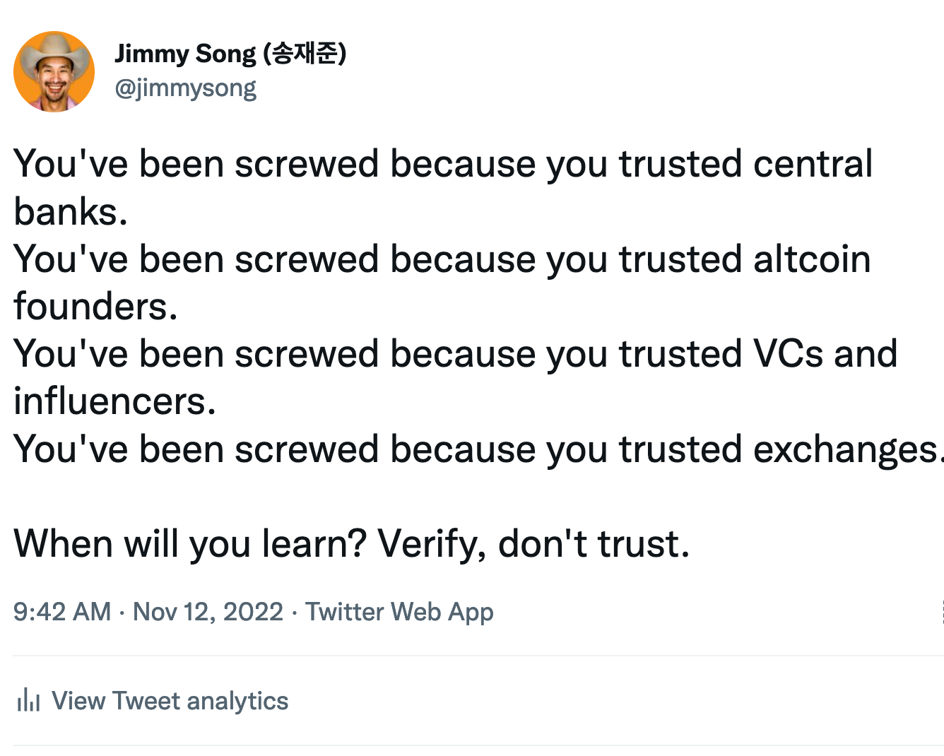 Don’t Trust, Verify - I said basically the same thing to many reporters about FTX and how too many people are trusting and not verifying. Especially in Latin America, where trusting central banks bites you in your wallet on a continuous, obvious way, this message really needs to be spread far and wide. Trusting USD, in particular seems to be their alternative, but that’s proving to be pretty bad given the inflation the last few years.