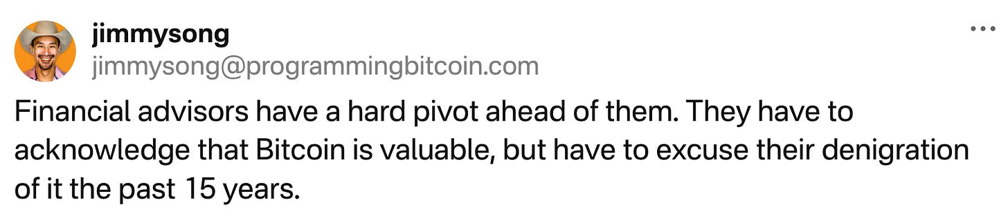 Bitcoin Treasuries - This is written by a Bitcoin hater (Matt Levine), but it’s nevertheless worth reading, for the insight it offers on why Bitcoin treasury companies make sense at the moment. Every Bitcoin in a treasury is worth two to a Bitcoin treasury company, which means that they’re incentivized not just to buy lots of Bitcoin but also to not sell. The irony is that the author doesn’t recognize that this dynamic is much worse in a fractional reserve system with dollars at a bank.